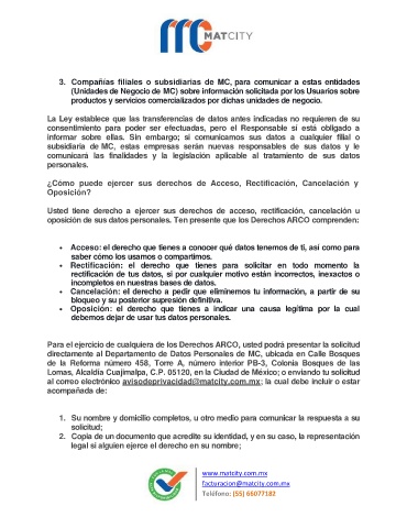 al correo electrónico avisodeprivacidad@matcity.com.mx; la cual debe incluir o estar